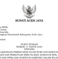 Seruan tersebut diperkuat melalui Surat Edaran Bupati Aceh Jaya Nomor 11 Tahun 2025 tentang Pelaksanaan Pembayaran PBB-P2 bagi ASN, PPPK, dan Aparatur Gampong. Surat edaran ini mengatur agar setiap aparatur melampirkan bukti lunas PBB-P2 sebelum pencairan hak-hak keuangan dilakukan.